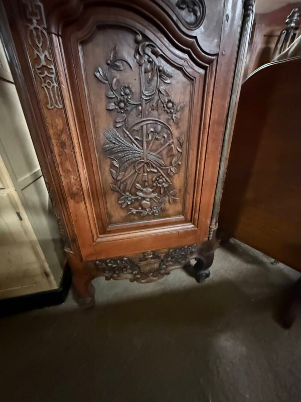 Superbe manjadou - garde-manger du sud - en bois massif finement sculpté, de style Louis XV. Ce meuble d’époque se distingue par ses ornements floraux élégants, son fronton richement décoré et son ouverture partiellement ajourée avec barreaux tournés, offrant à la fois charme et raffinement.