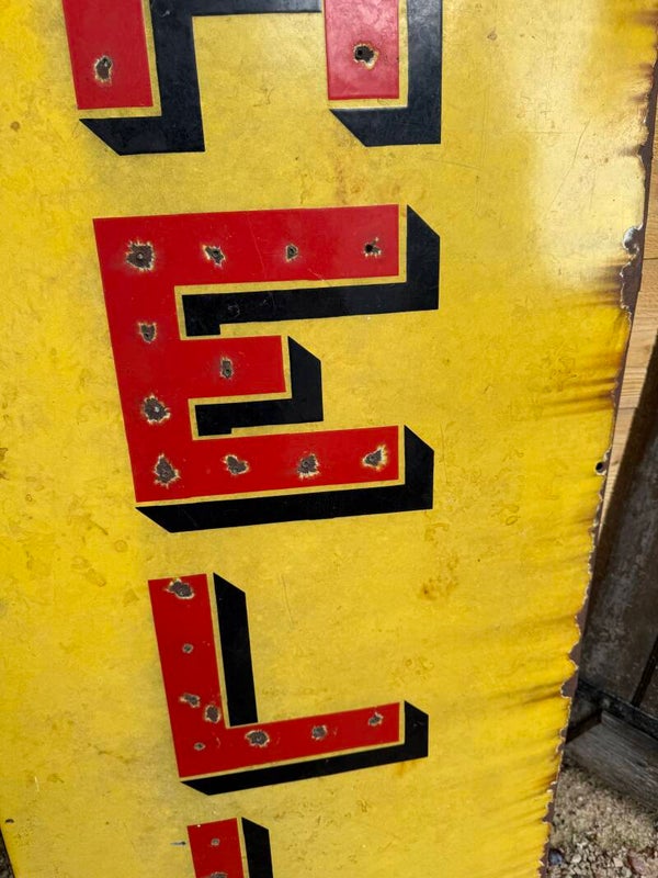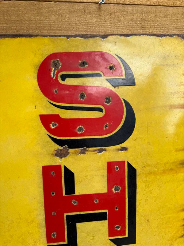 Grande plaque émaillée Shell « En vente ici » – 169 × 60 cm – Publicité ancienne