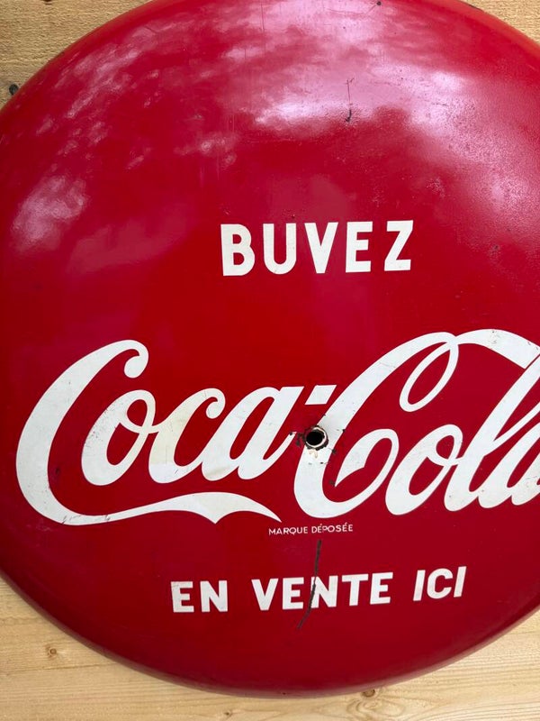 Plaque publicitaire Coca-Cola bombée – "Buvez Coca-Cola, en vente ici" – Grand format (84 cm, années 50–60)