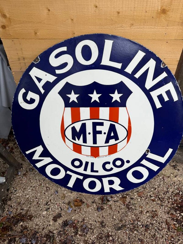 Plaque émaillée publicitaire américaine de la coopérative MFA Oil Company (Missouri Farmers Association), fondée en 1929.