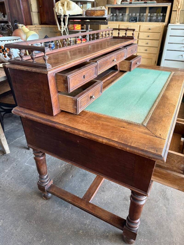 Le plateau, gainé de feutrine verte, est surmonté d’un gradin à galerie ajourée, orné de plusieurs tiroirs destinés à conserver correspondances, plumes et encriers. Le plateau se tire vers l'avant permettant une surface de travail accrue.