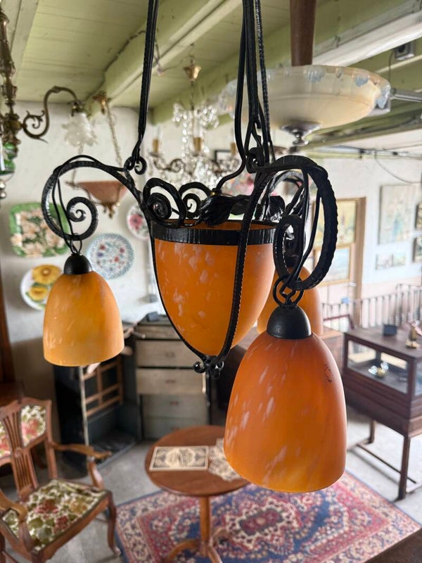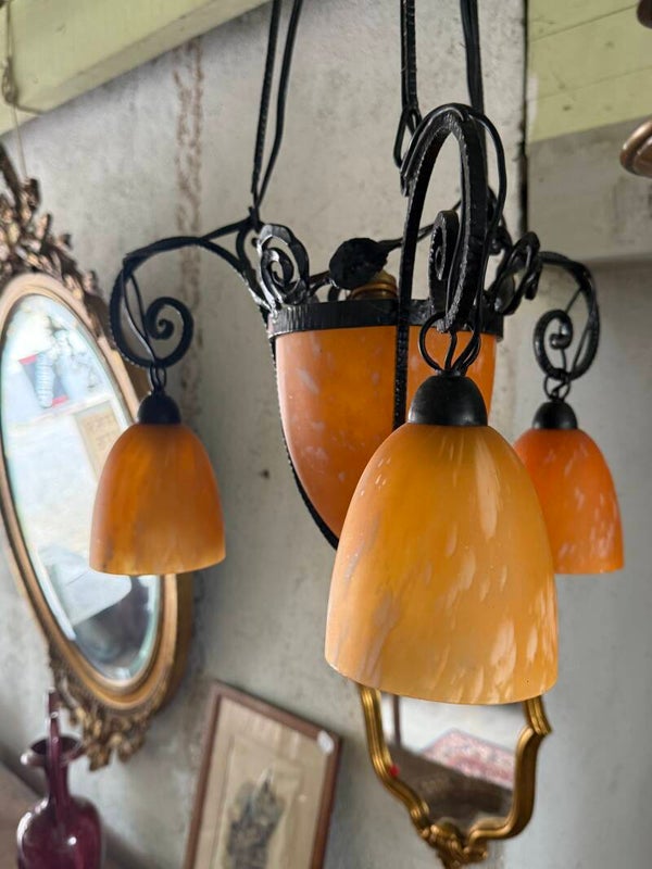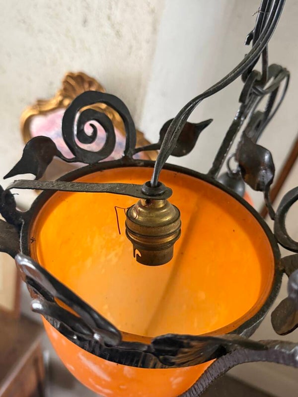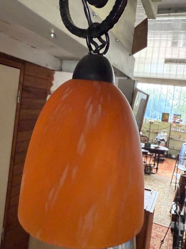 Lustre Art Déco en fer forgé et pâte de verre – vers 1930