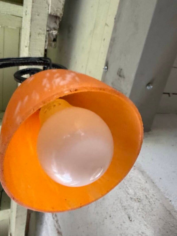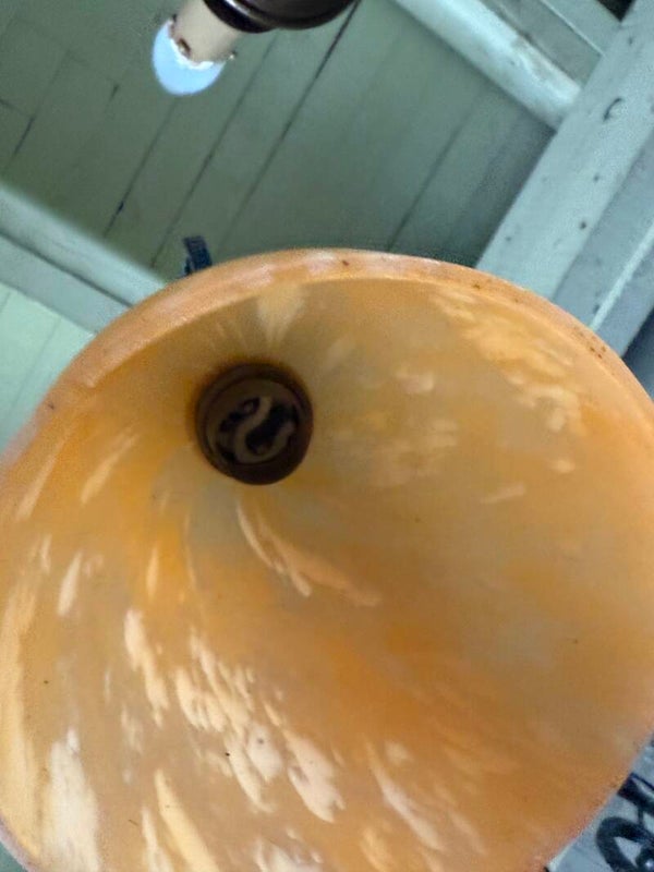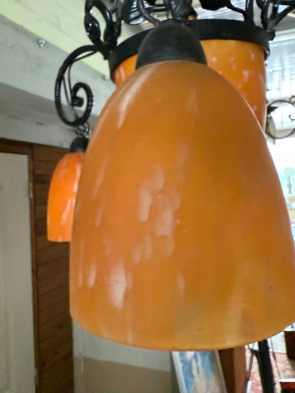 Il est composé d’une vasque centrale et de trois tulipes en pâte de verre teintée orange nuancé de blanc, typiques de la production des années 1930 (dans le goût de Muller Frères ou Schneider). Il n'est pas signé.