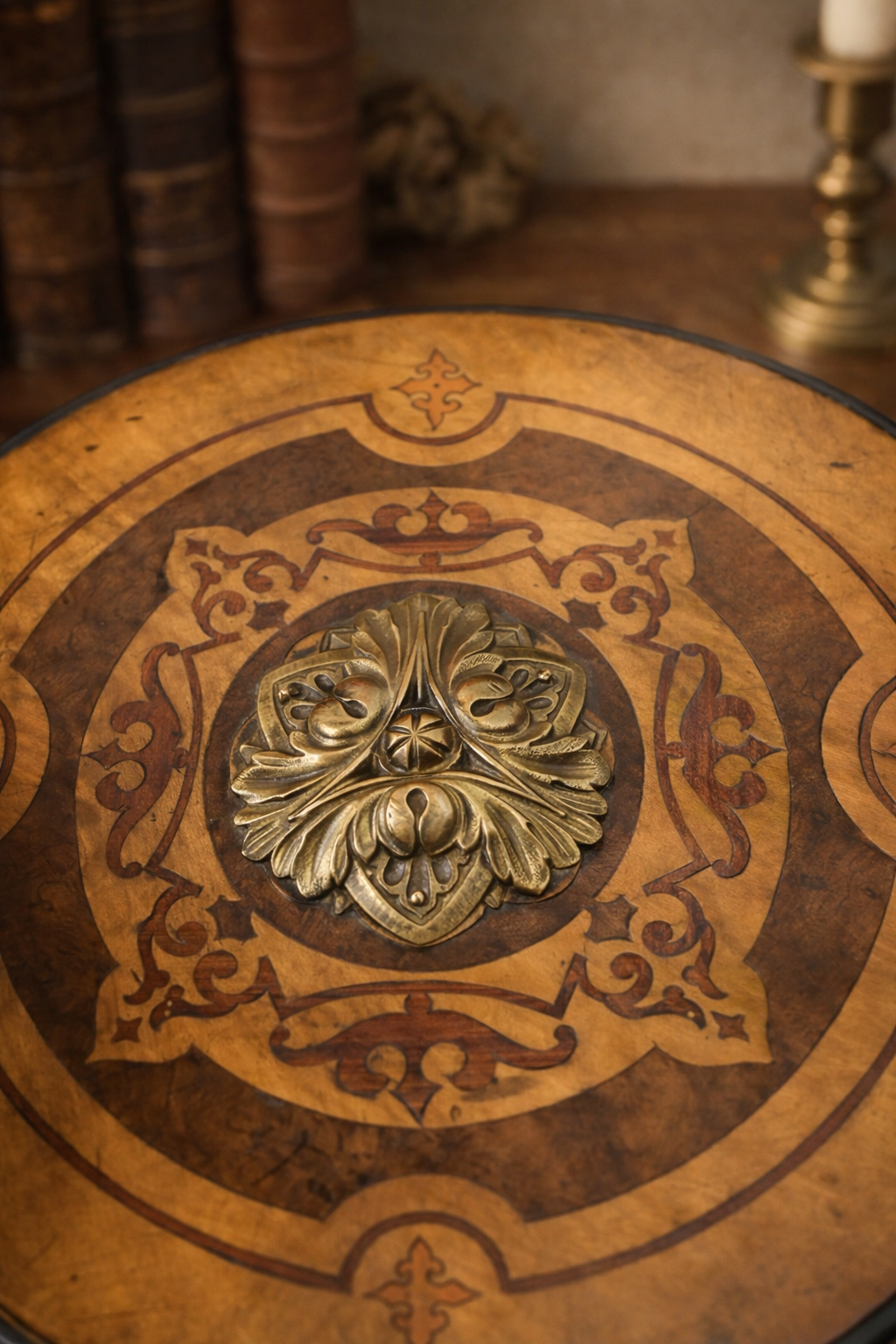 Élégant coffret à bijoux d’époque Napoléon III, de forme circulaire, présentant un travail raffiné de placage en loupe agrémenté d’un décor marqueté finement dessiné.
